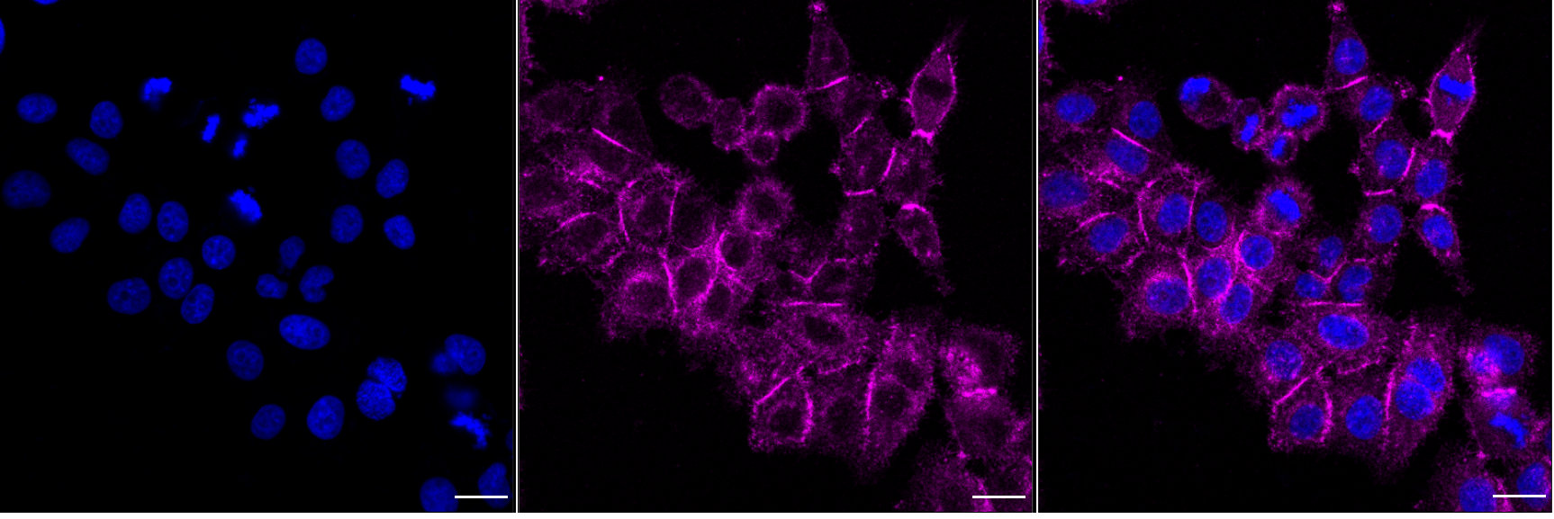 Immunocytochemical staining of HepG2 cells with L1 cell adhesion molecule antibody. Nuclei were stained blue with DAPI; L1 cell adhesion molecule was stained magenta with Alexa Fluor? 647. Images were taken using Leica stellaris 5. Protein abundance based on laser Intensity and Smart Gain:Medium. Scale bar, 20 μm.