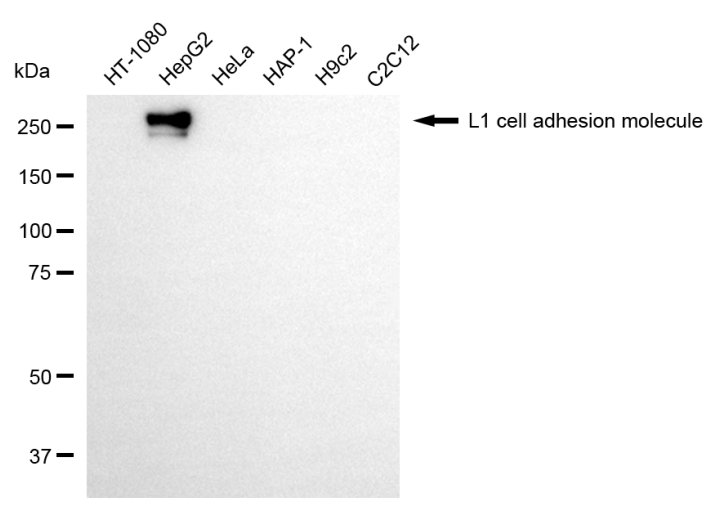 Western blotting analysis using L1 cell adhesion molecule antibody. Total cell lysates (30 μg) from various cell lines were loaded and separated by SDS-PAGE. The blot was incubated with L1 cell adhesion molecule antibody and HRP-conjugated goat anti-mouse secondary antibody respectively.