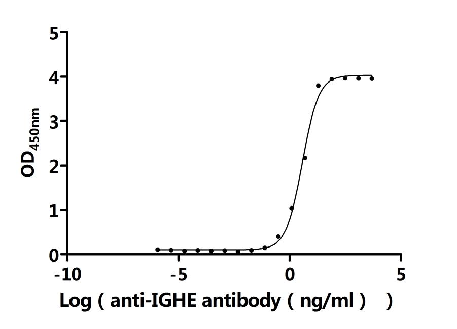 Measured by its binding ability in a functional ELISA. Immobilized Human IGHE at 2 μg/ml can bind Anti-IGHE recombinant antibody (CSB-RA16849MA1HU). The EC50 is 3.097-4.487 ng/mL. Biological Activity Assay