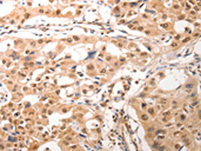 The image on the left is immunohistochemistry of paraffin-embedded Human lung cancer tissue using CSB-PA245457(CDC6 Antibody) at dilution 1/25, on the right is treated with synthetic peptide. (Original magnification: ×200)