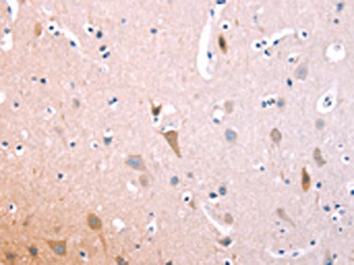 The image on the left is immunohistochemistry of paraffin-embedded Human brain tissue using CSB-PA984274(IL1RL1 Antibody) at dilution 1/70, on the right is treated with fusion protein. (Original magnification: ×200)