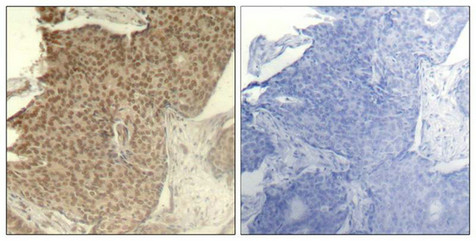Immunohistochemical analysis of paraffin-embedded human breast carcinoma tissue using HDAC2(Phospho-Ser394) Antibody(left) or the same antibody preincubated with blocking peptide(right).