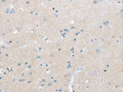 The image on the left is immunohistochemistry of paraffin-embedded Human brain tissue using CSB-PA920694(TNFSF4 Antibody) at dilution 1/20, on the right is treated with synthetic peptide. (Original magnification: ×200)