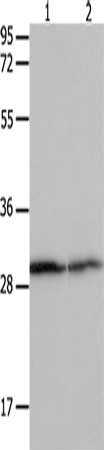 Gel: 12%SDS-PAGE, Lysate: 30 μg, Lane 1-2: Hela cells, mouse kidney tissue, Primary antibody: CSB-PA179192(YWHAB Antibody) at dilution 1/550, Secondary antibody: Goat anti rabbit IgG at 1/8000 dilution, Exposure time: 10 seconds
