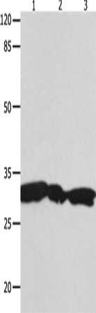 Gel: 10%SDS-PAGE, Lysate: 40 μg, Lane 1-3: Hela cells, 293T cells, Jurkat cells, Primary antibody: CSB-PA589658(YWHAG Antibody) at dilution 1/1800, Secondary antibody: Goat anti rabbit IgG at 1/8000 dilution, Exposure time: 10 seconds