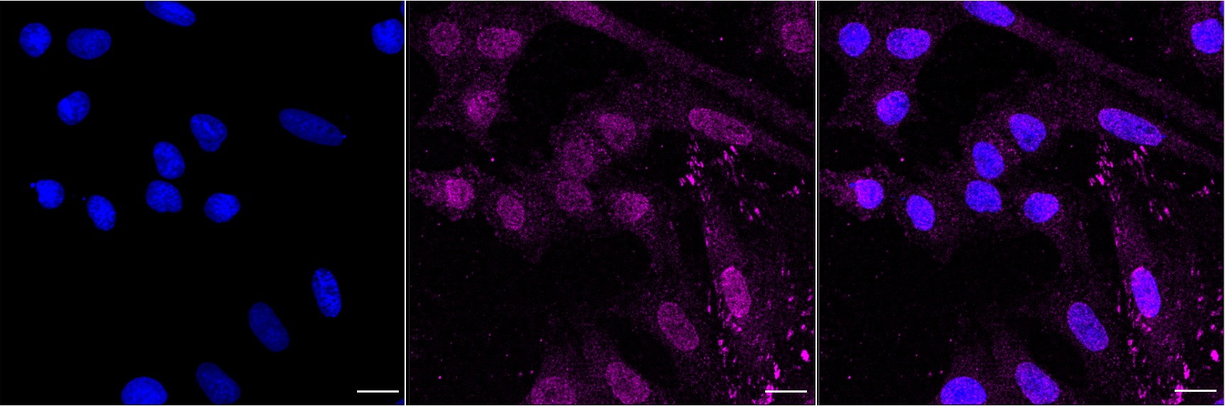 Immunocytochemical staining of HepG2 cells with ABCB1 antibody. Nuclei were stained blue with DAPI; ABCB1 was stained magenta with Alexa Fluor? 647. Images were taken using Leica stellaris 5. Protein abundance based on laser Intensity and smart gain: Medium. Scale bar, 20 μm.