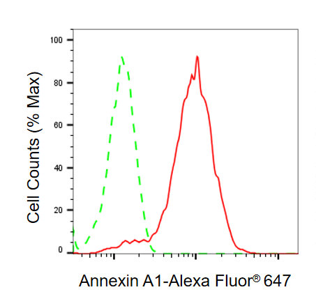 Flow cytometric analysis of Annexin A1 expression in HepG2 cells using Annexin A1 antibody. Green, isotype control; red, Annexin A1.