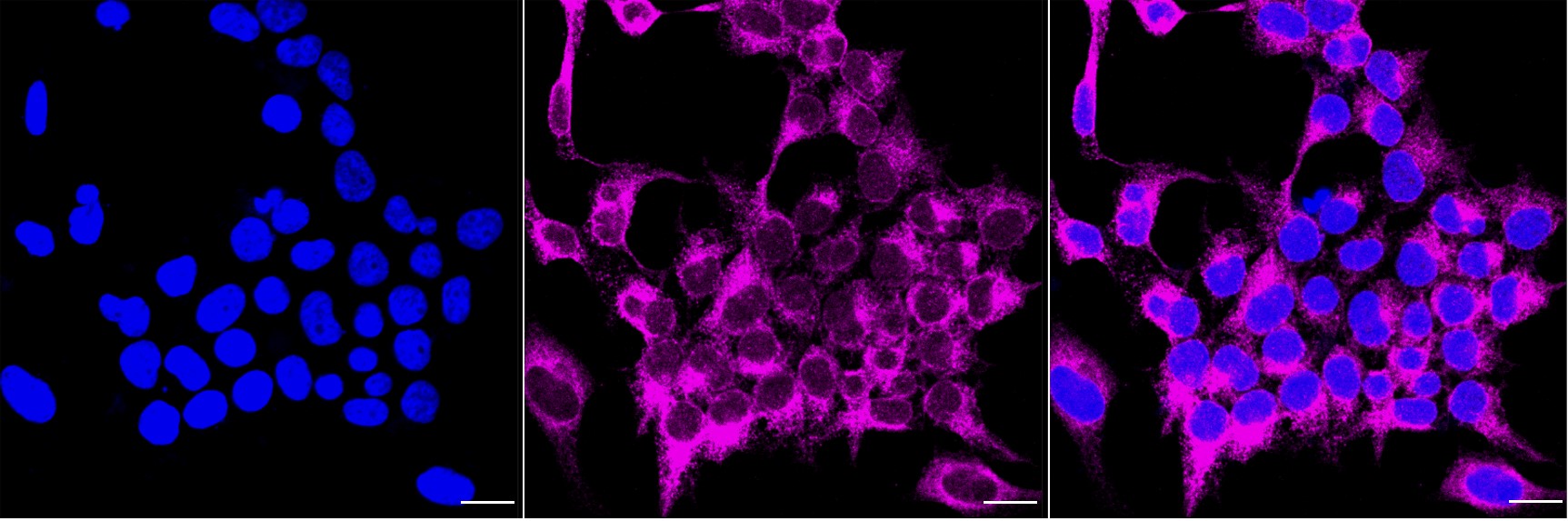 Immunocytochemical staining of Hela cells with ATP2A2 antibody. Nuclei were stained blue with DAPI; ATP2A2 was stained magenta with Alexa Fluor? 647. Images were taken using Leica stellaris 5. Protein abundance based on laser Intensity and smart gain: Medium. Scale bar, 20 μm.