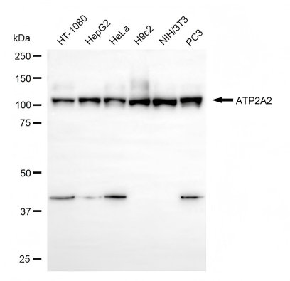 Western blotting analysis using ATP2A2 antibody. Total cell lysates (30 μg) from various cell lines were loaded and separated by SDS-PAGE. The blot was incubated with ATP2A2 antibody and HRP-conjugated goat anti-rabbit secondary antibody respectively.