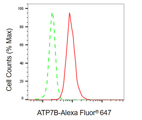 Flow cytometric analysis of ATP7B expression in HepG2 cells using ATP7B antibody. Green, isotype control; red, ATP7B.