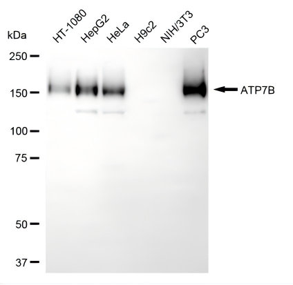 Western blotting analysis using ATP7B antibody. Total cell lysates (30 μg) from various cell lines were loaded and separated by SDS-PAGE. The blot was incubated with ATP7B antibody and HRP-conjugated goat anti-rabbit secondary antibody respectively.
