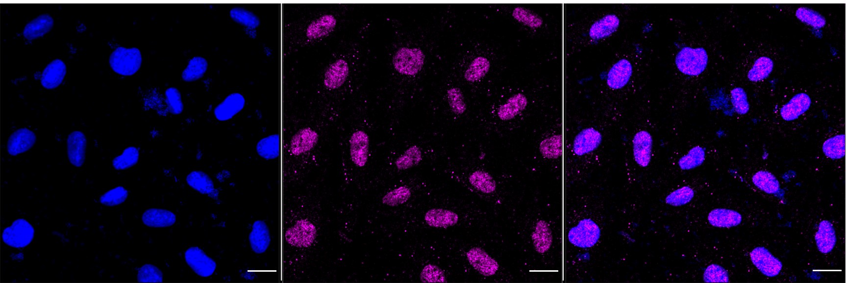 Immunocytochemical staining of H9c2 cells with BCAR1 antibody. Nuclei were stained blue with DAPI; BCAR1 was stained magenta with Alexa Fluor? 647. Images were taken using Leica stellaris 5. Protein abundance based on laser Intensity and smart gain: Medium. Scale bar, 20 μm.