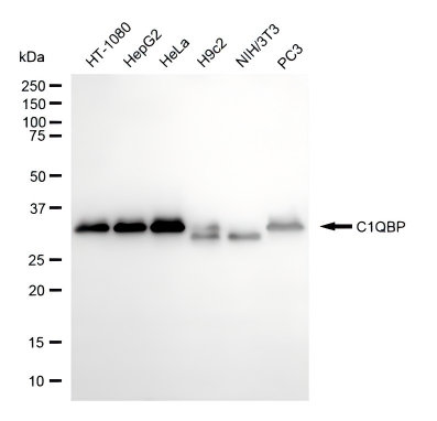 Western blotting analysis using C1QBP antibody. Total cell lysates (30 μg) from various cell lines were loaded and separated by SDS-PAGE. The blot was incubated with C1QBP antibody and HRP-conjugated goat anti-rabbit secondary antibody respectively.