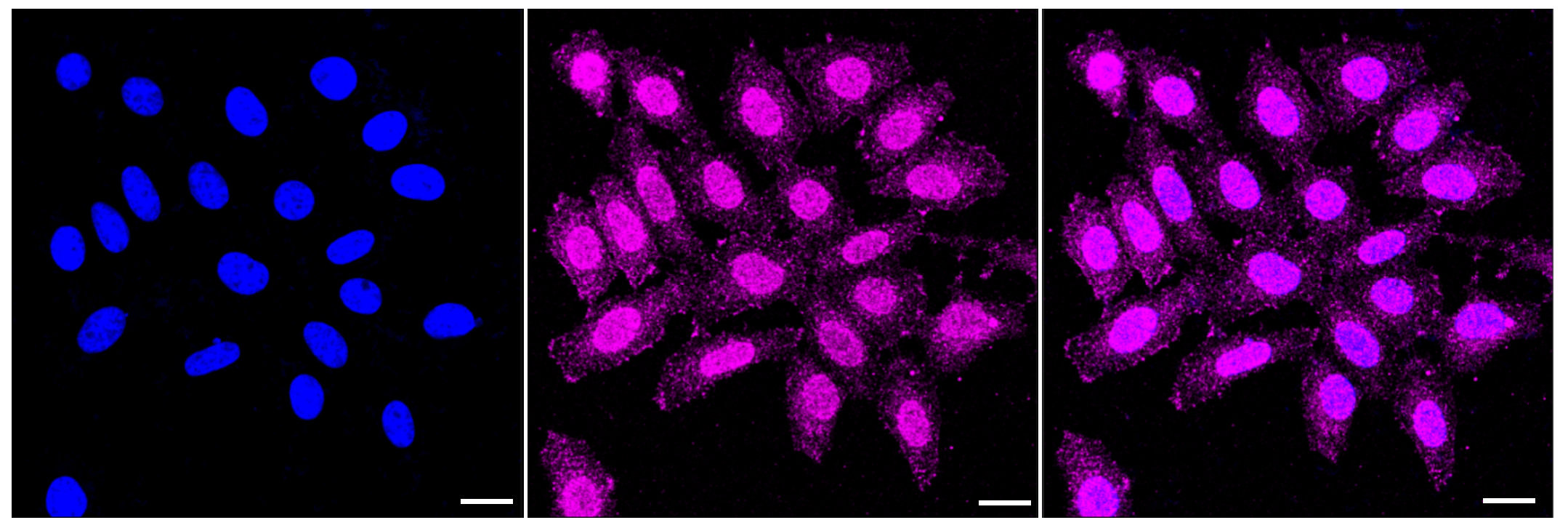 Immunocytochemical staining of HepG2 cells with C4BPB antibody. Nuclei were stained blue with DAPI; C4BPB was stained magenta with Alexa Fluor? 647. Images were taken using Leica stellaris 5. Protein abundance based on laser Intensity and smart gain: Medium. Scale bar: 20 μm.
