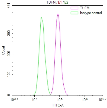 Overlay Peak curve showing A549 cells stained with CSB-RA004434MA1HU (red line) at 1:100. The cells were fixed in 4% formaldehyde and permeated by 0.2% TritonX-100 for 10min. Then 10% normal goat serum to block non-specific protein-protein interactions followed by the antibody (1ug/1*106cells) for 45min at 4℃. The secondary antibody used was Fluorescein (FITC) AffiniPure Goat Anti-Human IgG, Fcγ fragment specific at 1:200 dilution for 35min at 4℃.Control antibody (green line) was human IgG1 (1ug/1*106cells) used under the same conditions. Acquisition of >10,000 events was performed.