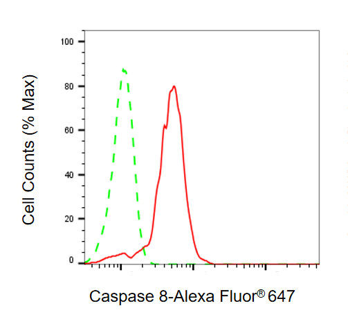 Flow cytometric analysis of Caspase 8 expression in HepG2 cells using Caspase 8 antibody. Green, isotype control; red, Caspase 8.