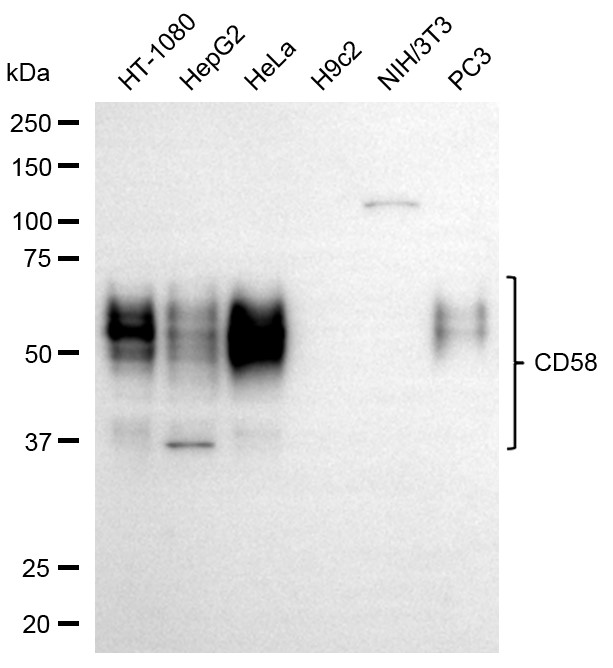 Western blotting analysis using CD58 antibody. Total cell lysates (30 μg) from various cell lines were loaded and separated by SDS-PAGE. The blot was incubated with CD58 antibody and HRP-conjugated goat anti-rabbit secondary antibody respectively.