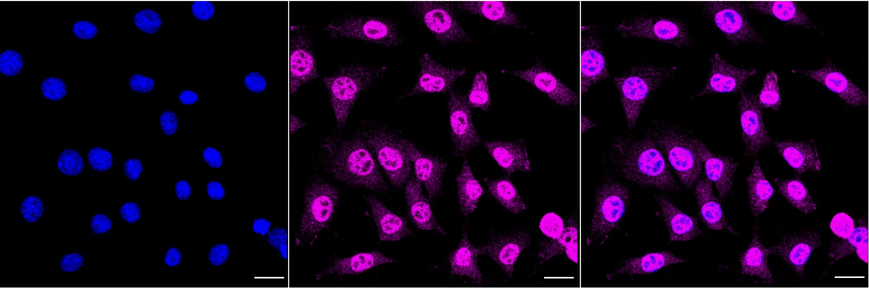Immunocytochemical staining of C2C12 cells with Cell division cycle 16 antibody. Nuclei were stained blue with DAPI; Cell division cycle 16 was stained magenta with Alexa Fluor? 647. Images were taken using Leica stellaris 5. Protein abundance based on laser Intensity and smart gain: Medium. Scale bar, 20 μm.