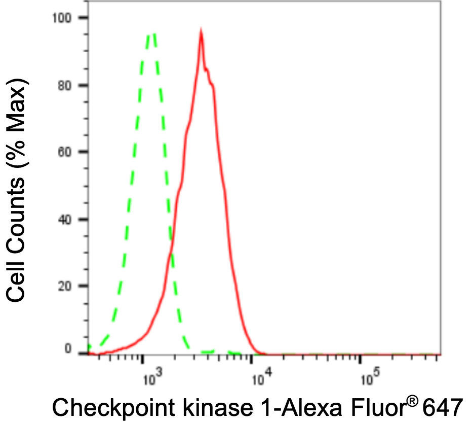 Flow cytometric analysis of Checkpoint kinase 1 expression in HepG2 cells using Checkpoint kinase 1 antibody. Green, isotype control; red, Checkpoint kinase 1.