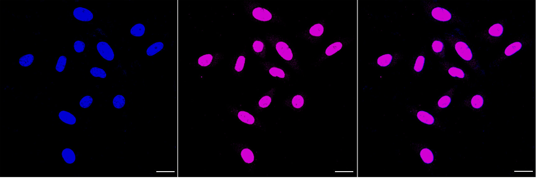 Immunocytochemical staining of HepG2 cells with CIRBP antibody. Nuclei were stained blue with DAPI; CIRBP was stained magenta with Alexa Fluor? 647. Images were taken using Leica stellaris 5. Protein abundance based on laser Intensity and smart gain: High. Scale bar, 20 μm.