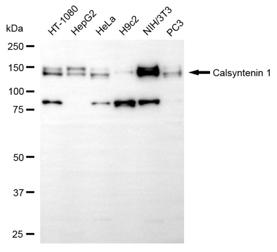 Western blotting analysis using calsyntenin 1 antibody. Total cell lysates (30 μg) from various cell lines were loaded and separated by SDS-PAGE. The blot was incubated with calsyntenin 1 antibody and HRP-conjugated goat anti-rabbit secondary antibody respectively.