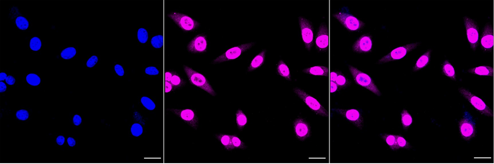 Immunocytochemical staining of HepG2 cells with COPS3 antibody. Nuclei were stained blue with DAPI; COPS3 was stained magenta with Alexa Fluor? 647. Images were taken using Leica stellaris 5. Protein abundance based on laser Intensity and smart gain: High. Scale bar, 20 μm.