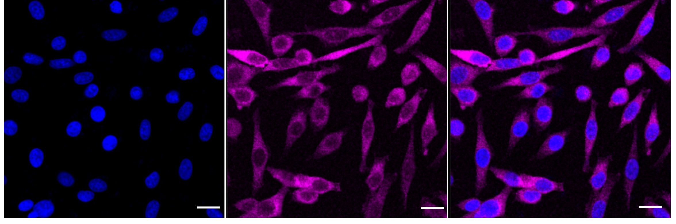 Immunocytochemical staining of HepG2 cells with EIF2AK2 antibody. Nuclei were stained blue with DAPI; EIF2AK2 was stained magenta with Alexa Fluor? 647. Images were taken using Leica stellaris 5. Protein abundance based on laser Intensity and smart gain: Medium. Scale bar: 20 μm.