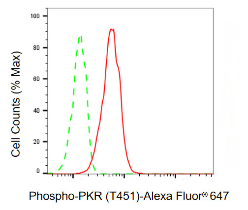Flow cytometric analysis of Phospho-Phospho-PKR (T451) expression in HT-1080 cells using Phospho-Phospho-PKR (T451) antibody. Green, isotype control; red, Phospho-Phospho-PKR (T451).