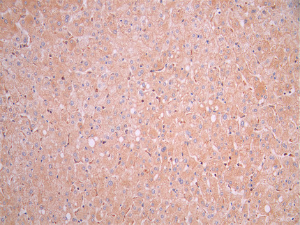 IHC image of CSB-RA547483A0HU diluted at 1:100 and staining in paraffin-embedded human liver tissue performed on a Leica BondTM system. After dewaxing and hydration, antigen retrieval was mediated by high pressure in a citrate buffer (pH 6.0). Section was blocked with 10% normal goat serum 30min at RT. Then primary antibody (1% BSA) was incubated at 4°C overnight. The primary is detected by a Goat anti-rabbit polymer IgG labeled by HRP and visualized using 0.05% DAB.