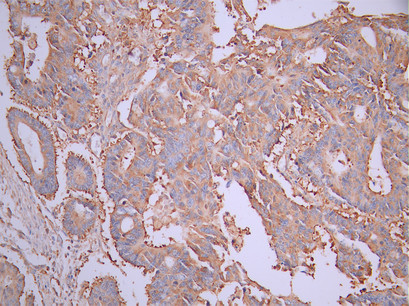 IHC image of CSB-RA547483A0HU diluted at 1:100 and staining in paraffin-embedded human colorectal cancer performed on a Leica BondTM system. After dewaxing and hydration, antigen retrieval was mediated by high pressure in a citrate buffer (pH 6.0). Section was blocked with 10% normal goat serum 30min at RT. Then primary antibody (1% BSA) was incubated at 4°C overnight. The primary is detected by a Goat anti-rabbit polymer IgG labeled by HRP and visualized using 0.05% DAB.