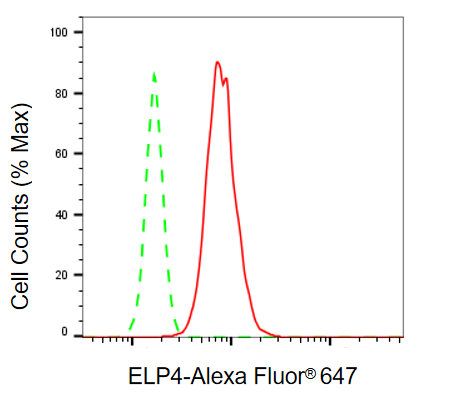 Flow cytometric analysis of ELP4 expression in C2C12 cells using ELP4 antibody. Green, isotype control; red, ELP4.