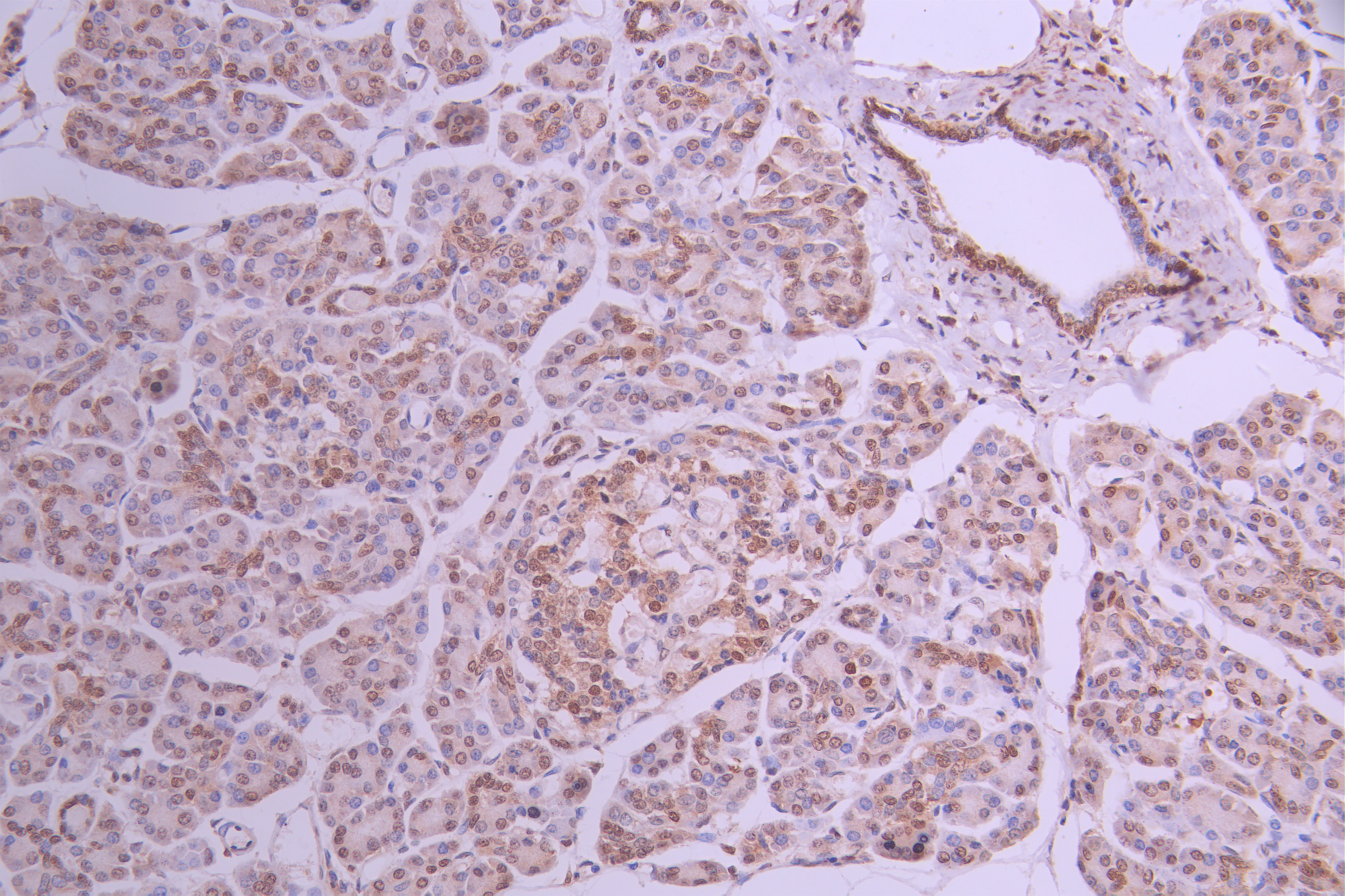 IHC image of CSB-RA007670MA1HU diluted at 1:50 and staining in paraffin-embedded human pancreatic tissue performed on a Leica BondTM system. After dewaxing and hydration, antigen retrieval was mediated by high pressure in a citrate buffer (pH 6.0). Section was blocked with 10% normal goat serum 30min at RT. Then primary antibody (1% BSA) was incubated at 4°C overnight. The primary is detected by a Goat anti-human polymer IgG labeled by HRP and visualized using 0.05% DAB.