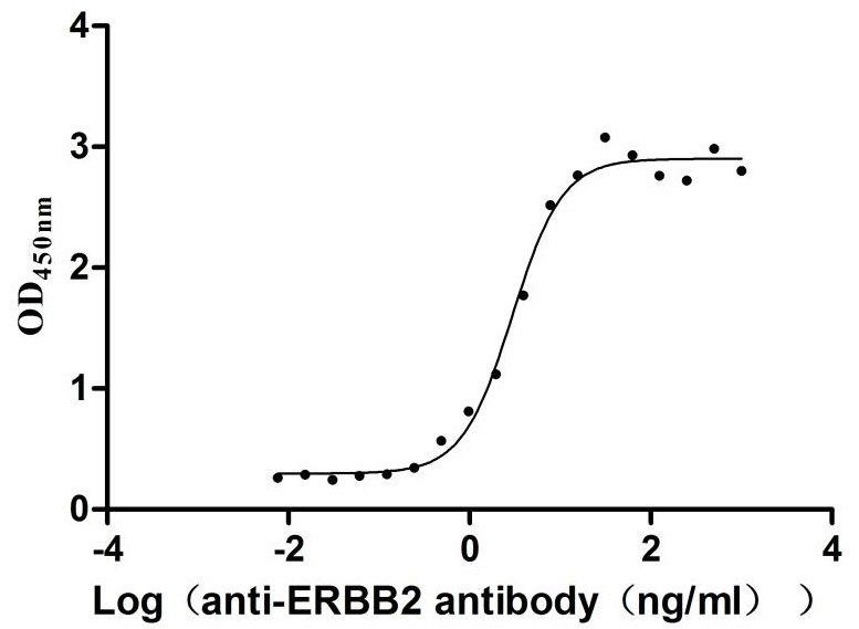 功能:Protein tyrosine kinase that is part of several cell surface receptor complexes, but that apparently needs a coreceptor for ligand binding. Essential component of a neuregulin-receptor complex, although neuregulins do not interact with it alone. GP30 is a potential ligand for this receptor. Regulates outgrowth and stabilization of peripheral microtubules (MTs). Upon ERBB2 activation, the MEMO1-RHOA-DIAPH1 signaling pathway elicits the phosphorylation and thus the inhibition of GSK3B at cell membrane. This prevents the phosphorylation of APC and CLASP2, allowing its association with the cell membrane. In turn, membrane-bound APC allows the localization of MACF1 to the cell membrane, which is required for microtubule capture and stabilization.; In the nucleus is involved in transcriptional regulation. Associates with the 5'-TCAAATTC-3' sequence in the PTGS2/COX-2 promoter and activates its transcription. Implicated in transcriptional activation of CDKN1A; the function involves STAT3 and SRC. Involved in the transcription of rRNA genes by RNA Pol I and enhances protein synthesis and cell growth.