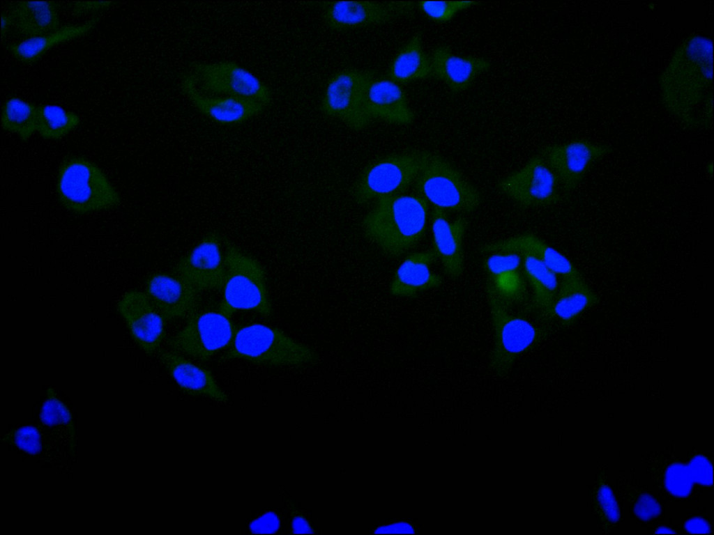 Immunofluorescence staining of Hela cell with CSB-RA909705A0HU at 1:50 , counter-stained with DAPI. The cells were fixed in 4% formaldehyde, permeabilized using 0.2% Triton X-100 and blocked in 10% normal Goat Serum. The cells were then incubated with the antibody overnight at 4°C. The secondary antibody was Alexa Fluor 488-congugated AffiniPure Goat Anti-Rabbit IgG(H+L).