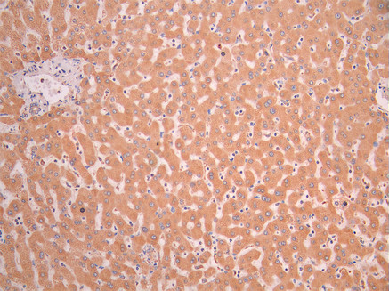 IHC image of CSB-RA909705A0HU diluted at 1:100 and staining in paraffin-embedded human liver tissue performed on a Leica BondTM system. After dewaxing and hydration, antigen retrieval was mediated by high pressure in a citrate buffer (pH 6.0). Section was blocked with 10% normal goat serum 30min at RT. Then primary antibody (1% BSA) was incubated at 4°C overnight. The primary is detected by a Goat anti-rabbit polymer IgG labeled by HRP and visualized using 0.05% DAB.