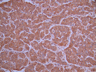 IHC image of CSB-RA909705A0HU diluted at 1:100 and staining in paraffin-embedded human liver cancer performed on a Leica BondTM system. After dewaxing and hydration, antigen retrieval was mediated by high pressure in a citrate buffer (pH 6.0). Section was blocked with 10% normal goat serum 30min at RT. Then primary antibody (1% BSA) was incubated at 4°C overnight. The primary is detected by a Goat anti-rabbit polymer IgG labeled by HRP and visualized using 0.05% DAB.