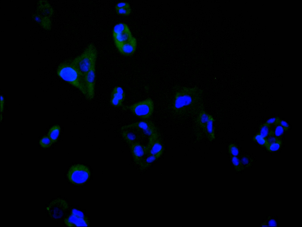 Immunofluorescence staining of HepG2 cell with CSB-RA577140A0HU at 1:50 , counter-stained with DAPI. The cells were fixed in 4% formaldehyde, permeabilized using 0.2% Triton X-100 and blocked in 10% normal Goat Serum. The cells were then incubated with the antibody overnight at 4°C. The secondary antibody was Alexa Fluor 488-congugated AffiniPure Goat Anti-Rabbit IgG(H+L).