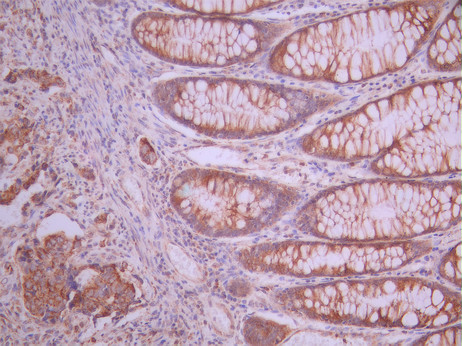 IHC image of CSB-RA577140A0HU diluted at 1:100 and staining in paraffin-embedded human colorectal cancer performed on a Leica BondTM system. After dewaxing and hydration, antigen retrieval was mediated by high pressure in a citrate buffer (pH 6.0). Section was blocked with 10% normal goat serum 30min at RT. Then primary antibody (1% BSA) was incubated at 4°C overnight. The primary is detected by a Goat anti-rabbit polymer IgG labeled by HRP and visualized using 0.05% DAB.