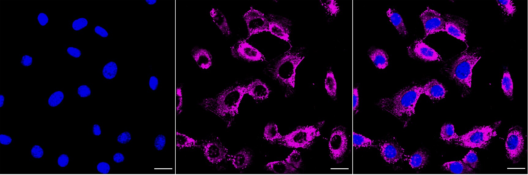 Immunocytochemical staining of C2C12 cells with Fibronectin 1 antibody. Nuclei were stained blue with DAPI; Fibronectin 1 was stained magenta with Alexa Fluor? 647. Images were taken using Leica stellaris 5. Protein abundance based on laser Intensity and smart gain: High. Scale bar, 20 μm.