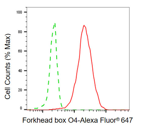 Flow cytometric analysis of forkhead box O4 expression in HeLa cells using forkhead box O4 antibody. Green, isotype control; red, forkhead box O4.