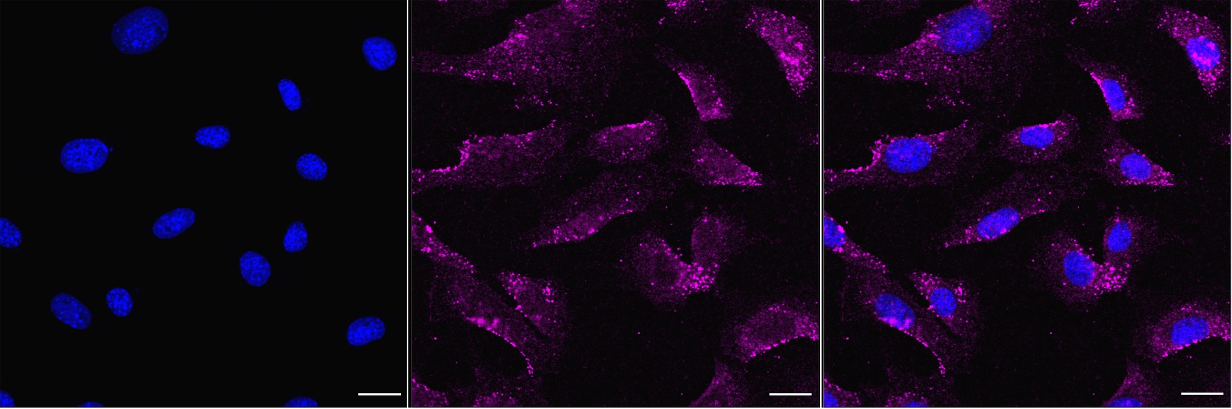 Immunocytochemical staining of HeLa cells with Forkhead box O4 antibody. Nuclei were stained blue with DAPI; Forkhead box O4 was stained magenta with Alexa Fluor? 647. Images were taken using Leica stellaris 5. Protein abundance based on laser Intensity and smart gain: Medium. Scale bar, 20 μm.