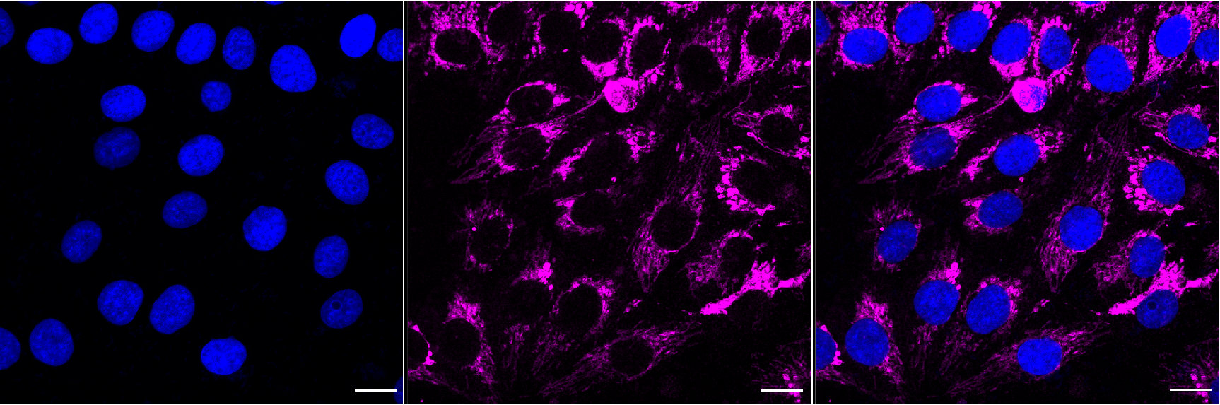 Immunocytochemical staining of HT-1080 cells with Hsp60 antibody. Nuclei were stained blue with DAPI; Hsp60 was stained magenta with Alexa Fluor? 647. Images were taken using Leica stellaris 5. Protein abundance based on laser Intensity and smart gain: High. Scale bar, 20 μm.