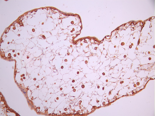 IHC image of CSB-RA140861A0HU diluted at 1:100 and staining in paraffin-embedded human placenta tissue performed on a Leica BondTM system. After dewaxing and hydration, antigen retrieval was mediated by high pressure in a citrate buffer (pH 6.0). Section was blocked with 10% normal goat serum 30min at RT. Then primary antibody (1% BSA) was incubated at 4°C overnight. The primary is detected by a Goat anti-rabbit polymer IgG labeled by HRP and visualized using 0.05% DAB.