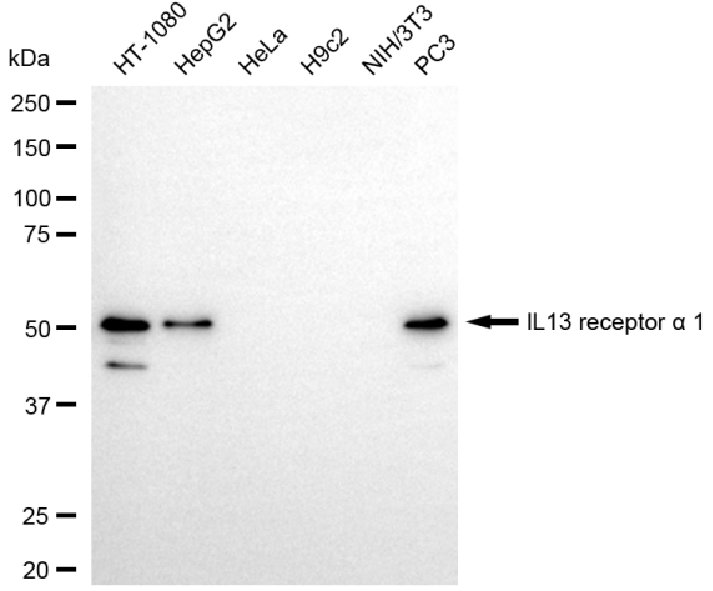 Western blotting analysis using IL13 receptor alpha 1 antibody. Total cell lysates (30 μg) from various cell lines were loaded and separated by SDS-PAGE. The blot was incubated with IL13 receptor alpha 1 antibody and HRP-conjugated goat anti-rabbit secondary antibody respectively.