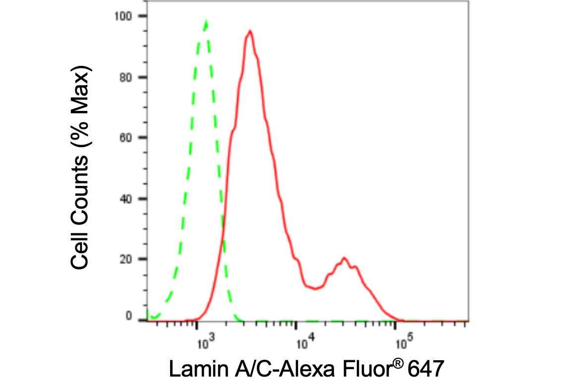 Flow cytometric analysis of Lamin A/C expression in HT-1080 cells using Lamin A/C antibody. Green, isotype control; red, Lamin A/C.