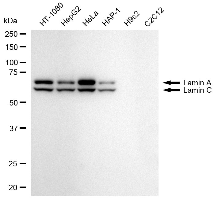 Western blotting analysis using Lamin A/C antibody. Total cell lysates (30 μg) from various cell lines were loaded and separated by SDS-PAGE. The blot was incubated with Lamin A/C antibody and HRP-conjugated goat anti-rabbit secondary antibody respectively.