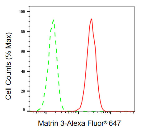 • Flow cytometric analysis of matrin 3 expression in HAP-1 cells using matrin 3 antibody. Green, isotype control; red, matrin 3.