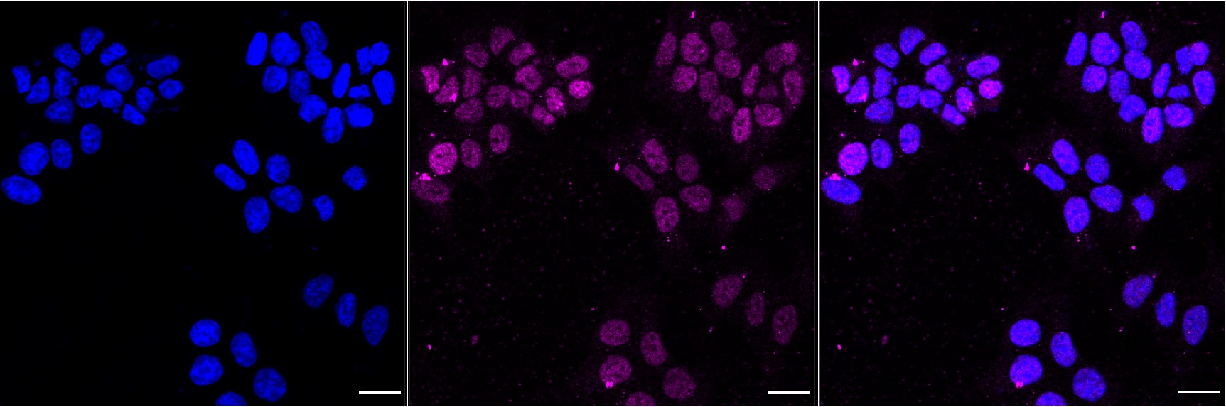 • Immunocytochemical staining of HAP-1 cells with Matrin 3 antibody. Nuclei were stained blue with DAPI; Matrin 3 was stained magenta with Alexa Fluor? 647. Images were taken using Leica stellaris 5. Protein abundance based on laser Intensity and smart gain: Medium. Scale bar, 20 μm.