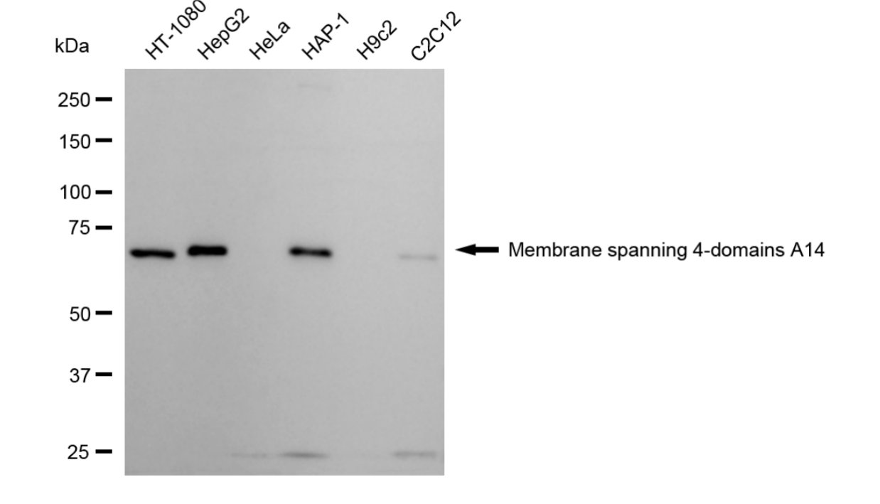 Western blotting analysis using Membrane spanning 4-domains A14 antibody. Total cell lysates (30 μg) from various cell lines were loaded and separated by SDS-PAGE. The blot was incubated with Membrane spanning 4-domains A14 antibody and HRP-conjugated goat anti-rabbit secondary antibody respectively.
