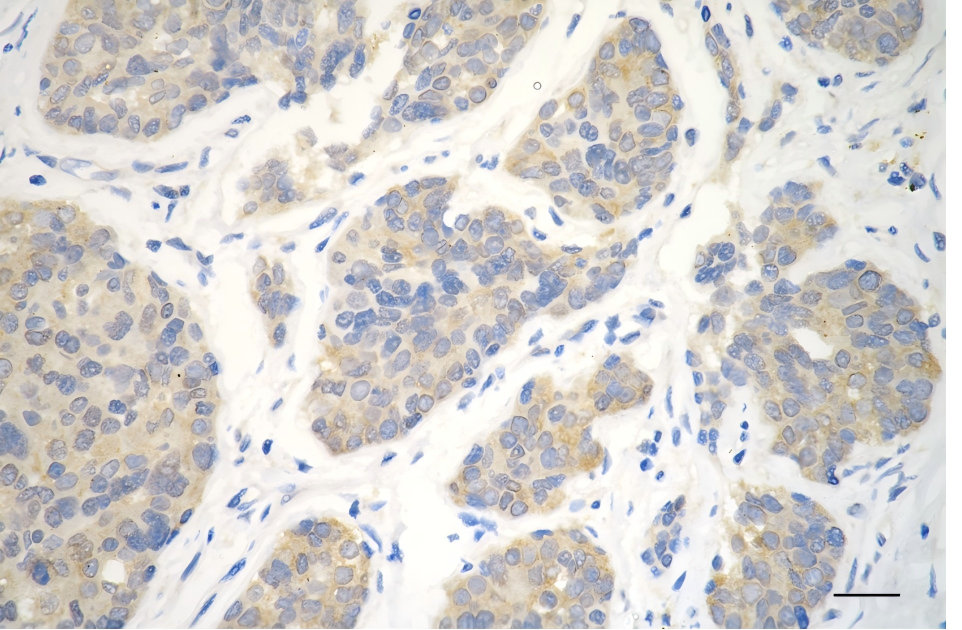 Immunohistochemistry was performed on paraffin-embedded human breast carcinoma using phospho-mTOR (S2448) antibody. Antigen retrieval was done in sodium citrate buffer (pH 6.0). DAB was used for detection, with hematoxylin counterstaining. Images were acquired using a Nikon Ci-L Plus microscope (40× objective). Scale bar: 25 μm.
